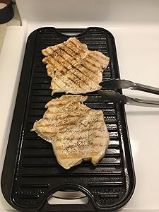 I love this thing! I already have three Lodge skillets, and I wanted a griddle to make more than one pancake at a time. I’m using an electric stove top, so the two sizes can be tricky for temperature, but I’ve seem to figure it out. You just put the smaller one on a slightly higher temperature, either half or a full setting up, so instead of 5 (medium) I would put 5 1/2 or 6. I see a lot of complaints about sticking when using the grill inside, and it scared me, but tonight I cooked chicken on the grill side, preheated for the 20 minutes like you’re supposed to, and when I flipped there was nothing sticking at all. See pictures. All I did was pre-heat, and spray some regular Pam, and put the chicken on. You have to make sure the meet is ready to flip, if you try to flip it too soon it will stick. Look up videos on YouTube, there’s tons of them.